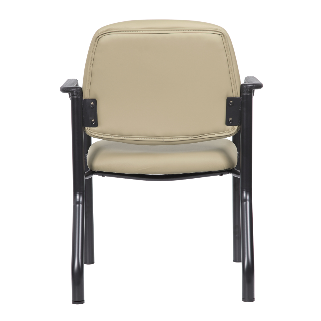SKU : B9591AM-BG This heavy duty and comfortable mid back guest chair is perfect for anyone seeking additional seating in any room or office. The guest chair is designed with a strong and easy to clean antimicrobial beige vinyl material that lends a professional appearance along with a sturdy four leg tubular black steel base that offers coziness and strength. The chair stands at a fixed height with a fixed arm design and boast a weight capacity of 300 lbs.