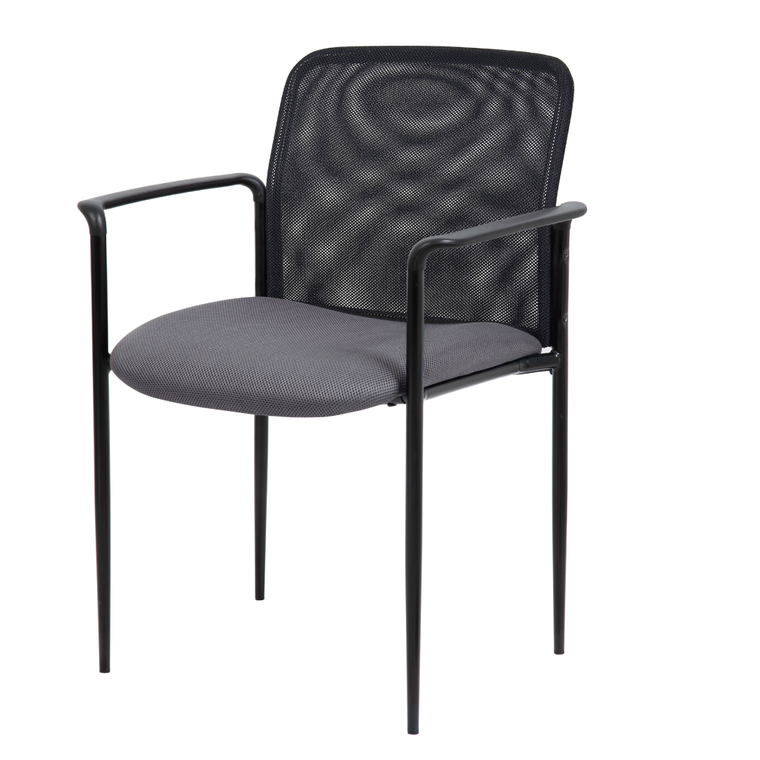 SKU : B6909-GY The stackable mesh guest chair in grey is the perfect addition to any room or office. For smaller spaces, the chair can be stacked 4 high and stored away when not in use. The chair is at a fixed height with fixed arms and is designed with a mesh seat as well as a breathable, airy mesh back. The grey chair adds a modern, professional appearance to any space and has a weight limit of 275 lbs.